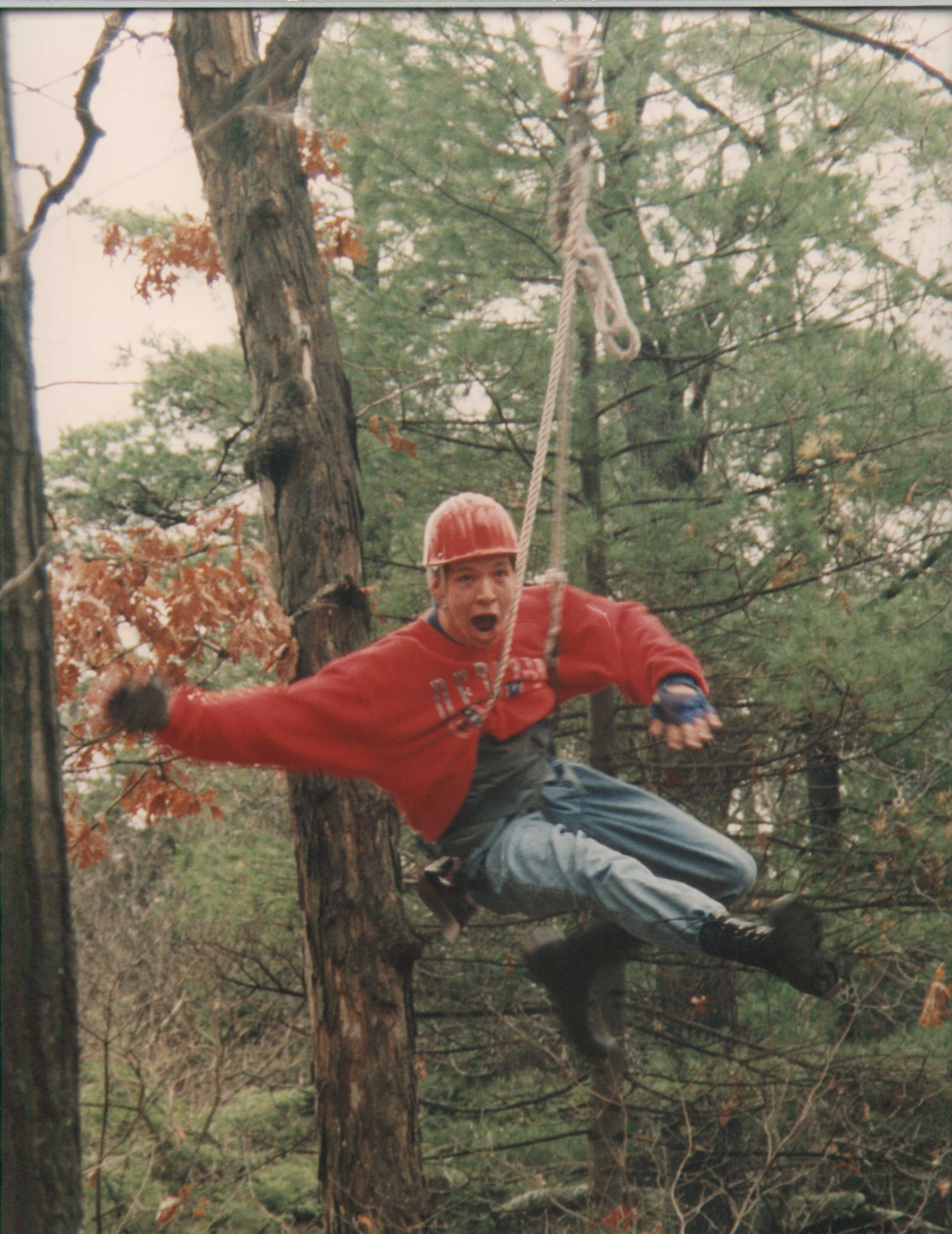 So far, all I have is this picture. It is of Jeff taken on A ropes Course on the zipline flying around a tree.